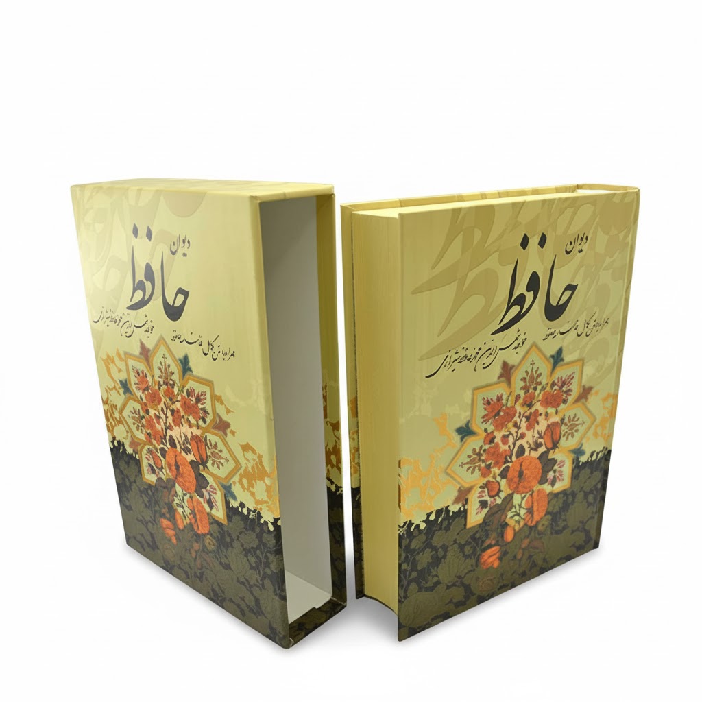 خرید فال حافظ با معنی با کاوری از نوع قابدار و جلد سلفونی زیبا میتواند هدیهای ارزشمند برای دوستان باشد. خط این حافظ نفیس از استاد مصطفی اشرفی است. وزن این کتاب 1.4 کیلوگرم بوده و در ۵۷۶ صفحهی ۴ رنگ چاپ شده است. کاغذ این کتاب حافظ از نوع کاغذ تحریری بوده و ابعاد تقریبی کتاب، ۱۷ در ۲۵ سانتیمتر است.
