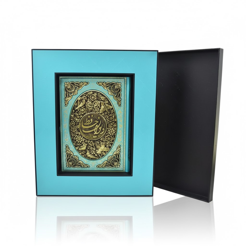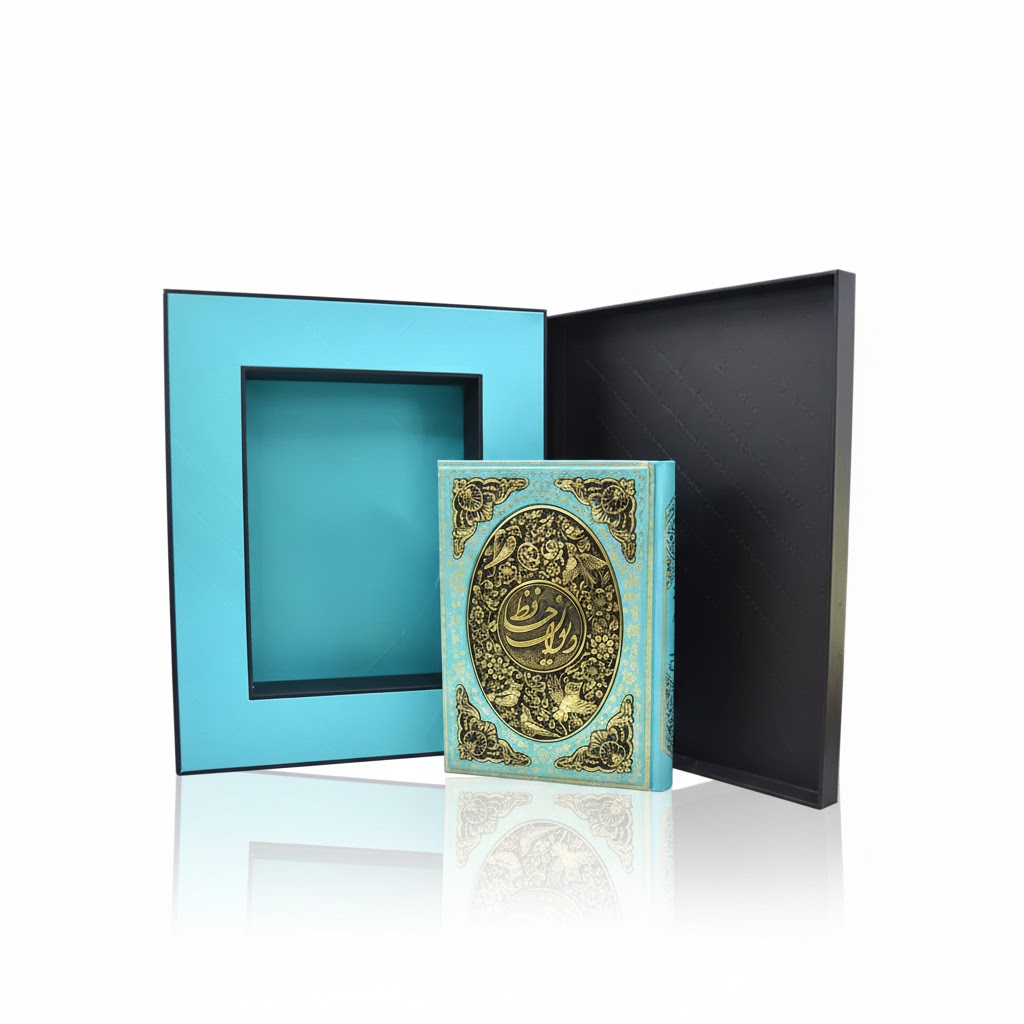 جلد ساخته شده برای آن از نوع چرم برجسته است و هنگام ارسال آن، یک ساک زیبای چوبی هم برای شما فرستاده میشود. باکس این دیوان حافظ بسیار در حفظ و نگهداری کتاب موثر است. همچنین قطع این کتاب وزیری بوده و با ابعاد 24 در 18 سانتیمتر و وزن 3.35 کیلو گرم، لازم به ذکر است که تمامی 539 صفحهی چهار رنگ آن گلاسه است و با خط نستعلیق نوشته شده است