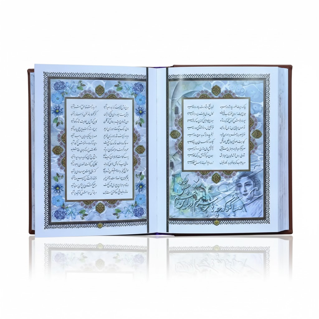 این کتاب حافظ طراحی شده به نسبت کاری که بر روی آن انجام شده است، بسیار مناسب است. این کتاب دارای جلد چرم و مس و کاور قاب کشویی است و کاغذ مصرفی در تمام 544 صفحه آن از نوع گلاسه انتخاب شده است. قطع جیبی این کتاب، به ابعاد 18 × 13 سانتیمتر، به شما این امکان را میدهد تا آن را بهراحتی جابهجا نمایید. همچنین اشعار آن، به خط نستعلیق در چهار رنگ منتشر شده است.