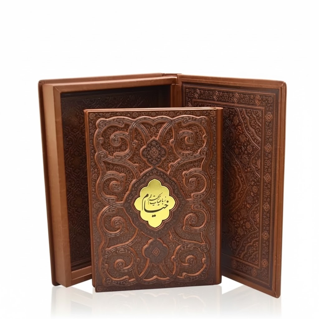 این مدل کتاب رباعیات خیام دارای جلد چرم، کاور از نوع جعبه بازشو، کاغذ عطری لب طلا، قطع وزیری، چاپ چهار رنگ و ابعاد 28 × 24 میباشد. کتاب رباعیات خیام نفیس از جمله کتابهای بسیار پرطرفدار محسوب میشود.